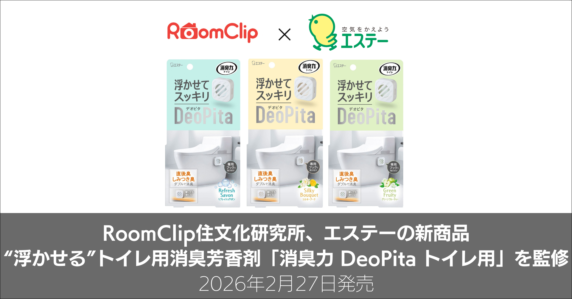 ルームクリップ株式会社(本社:東京都渋谷区、代表取締役社長:髙重正彦、以下ルームクリップ)が運営する「RoomClip住文化研究所」は、エステー株式会社(本社:東京都新宿区、代表 執行 役社長:上月洋、以下 エステー)が2026年2月27日より発売開始する“ 浮かせる ”トイレ用消臭 芳香 剤「 消臭力 DeoPita トイレ用 」の監修を行いました。本取り組みにおいて、RoomClip住文化研究所は、600万枚以上の膨大な投稿データからトイレ空間のトレンドを分析。生活者の潜在ニーズをデータで裏付け、コンセプト立案のための支援を全面的に行いました。ルームクリップは「人と人、人と企業が繋がる住生活の新しい産業と文化を築く」というビジョンの実現に向け、RoomClipに蓄積したデータや生活者のインサイトを活用した、住生活領域の企業様の商品開発やマーケティング支援を幅広く行なって参ります。