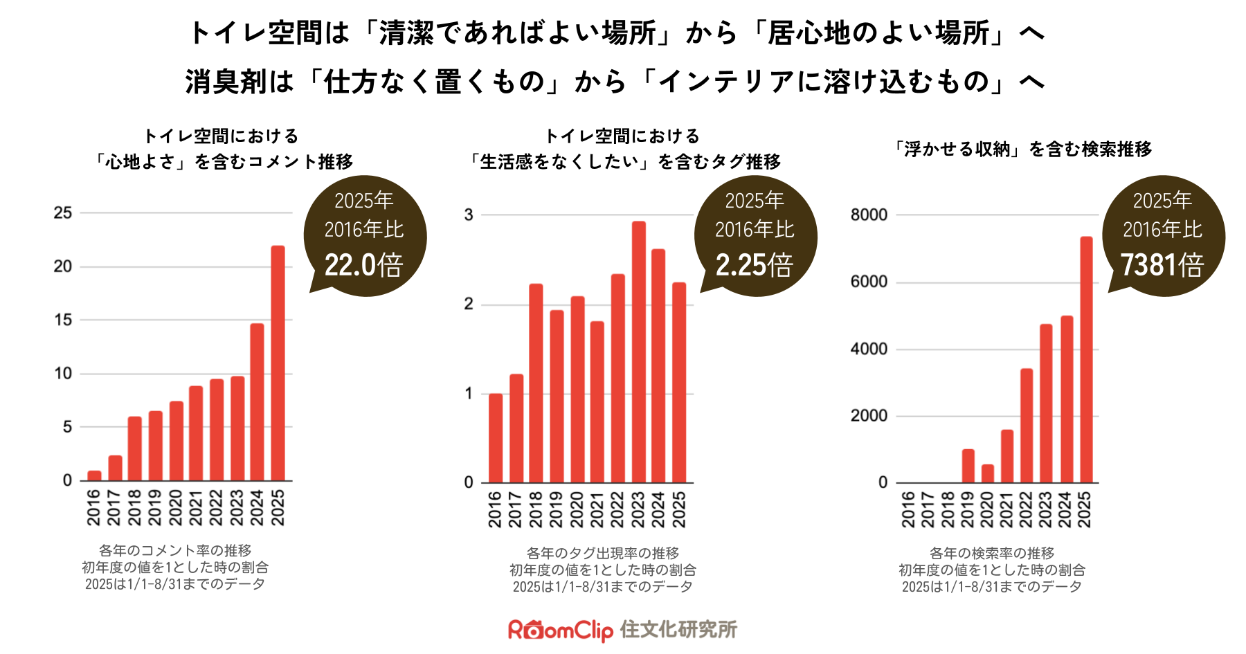 かつてトイレは機能重視の場所でしたが、「居心地のよい空間」としての価値が高まっています。RoomClip内のデータでは、トイレに関する投稿で「心地よさ」を含むコメント率(2016年比で約22.0倍※)や、「生活感をなくしたい」を含むコメント率(2016年比で約2.25倍※)が増加傾向にあり、好みのインテリアや照明、香りはもちろん、置かれる小物にまで統一感や配置の工夫を求める傾向が広がっています。