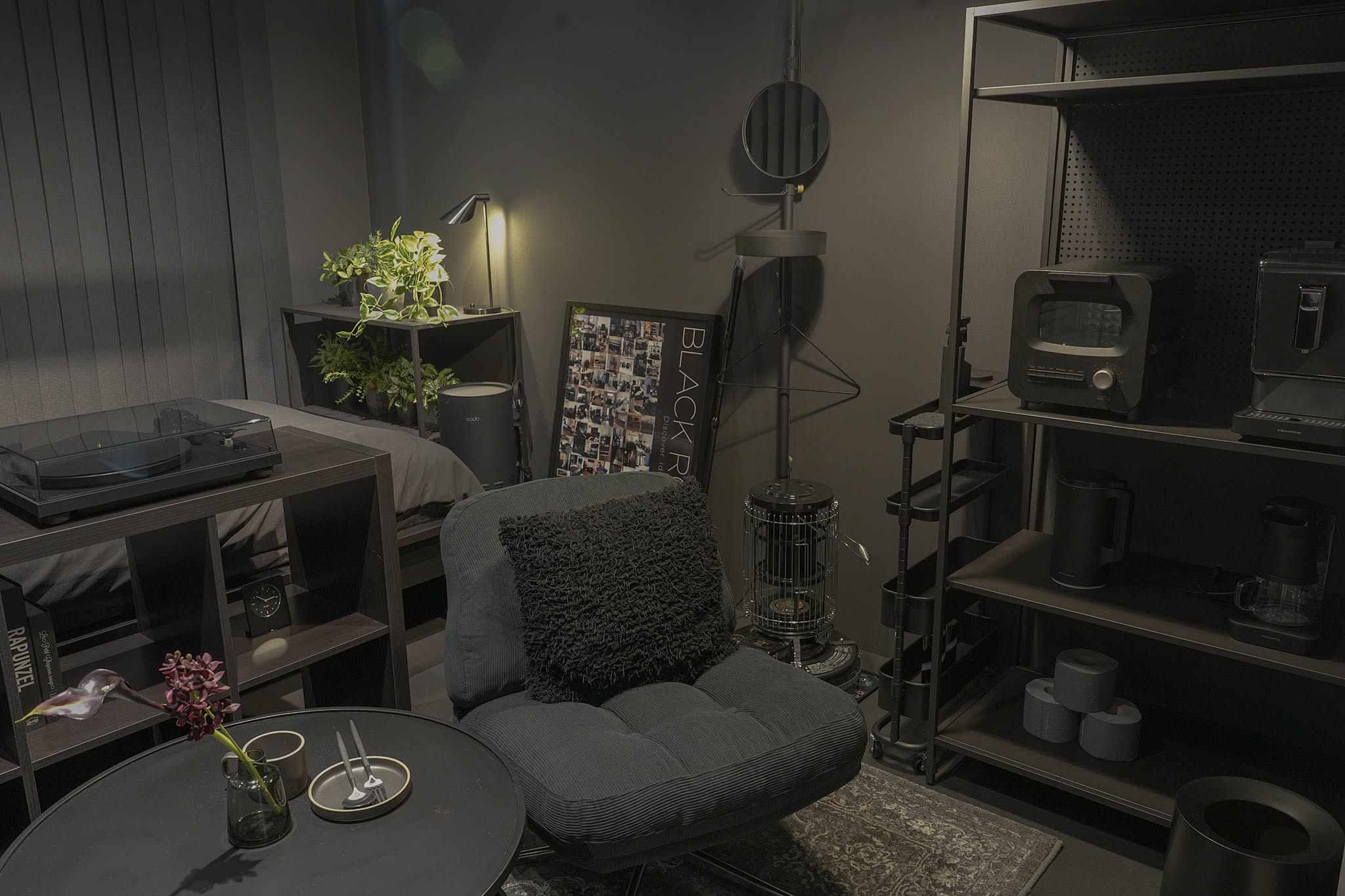 ダークトーンで統一された空間。色の深みによって生まれる凝縮感と、暮らしに宿るこだわりを表現。